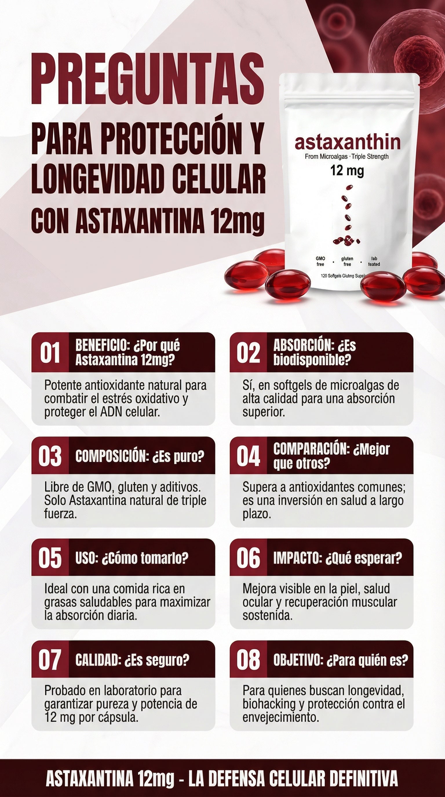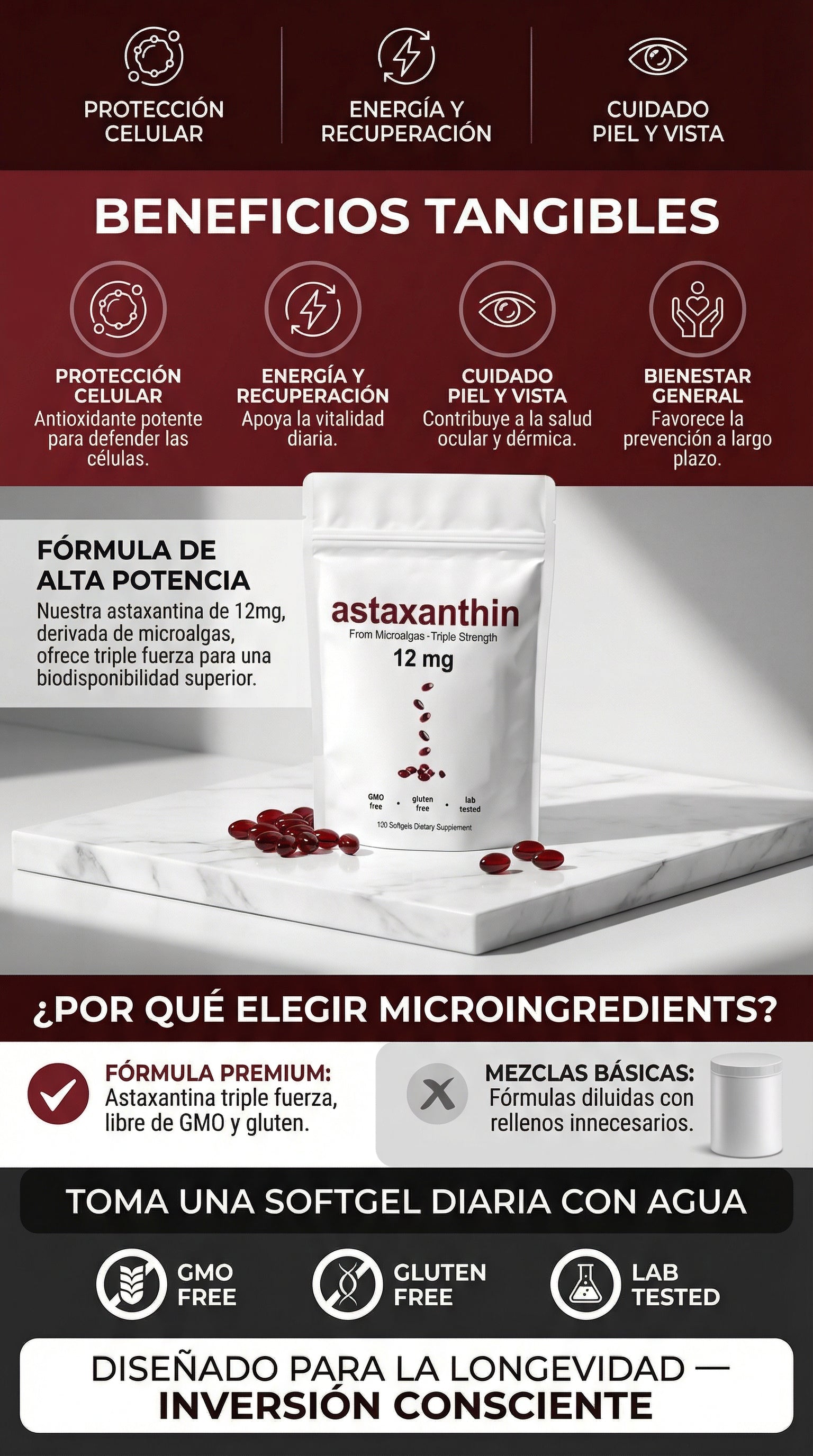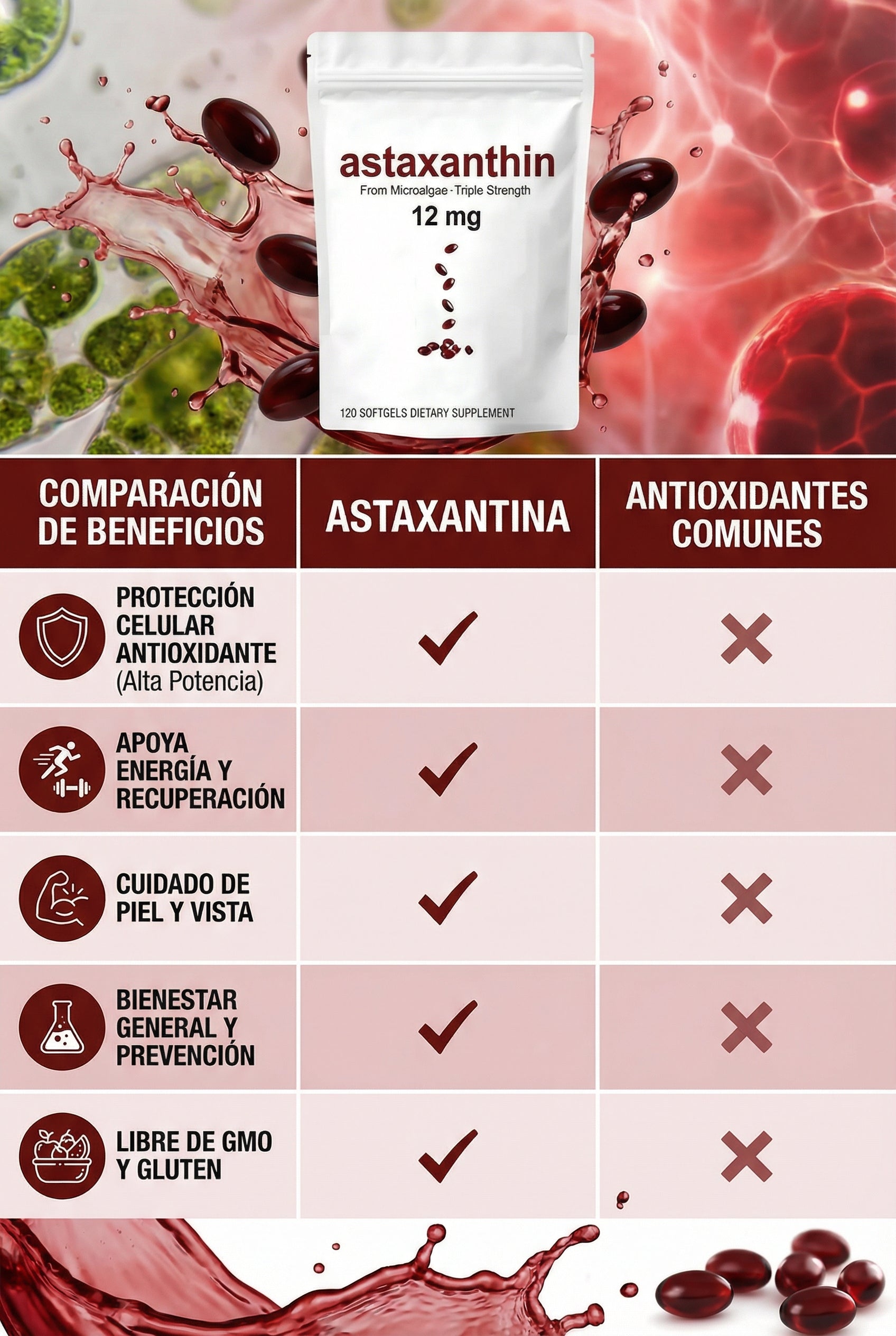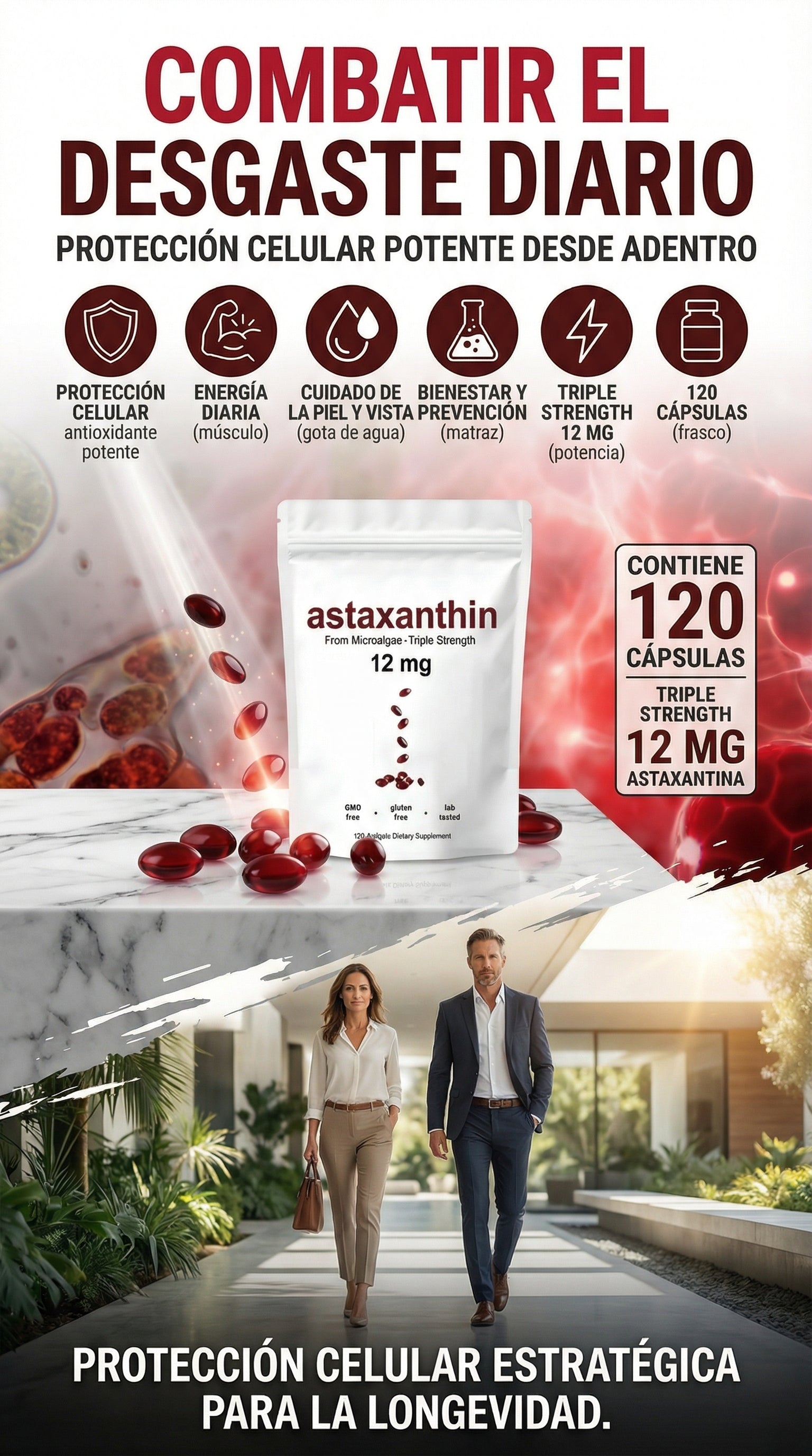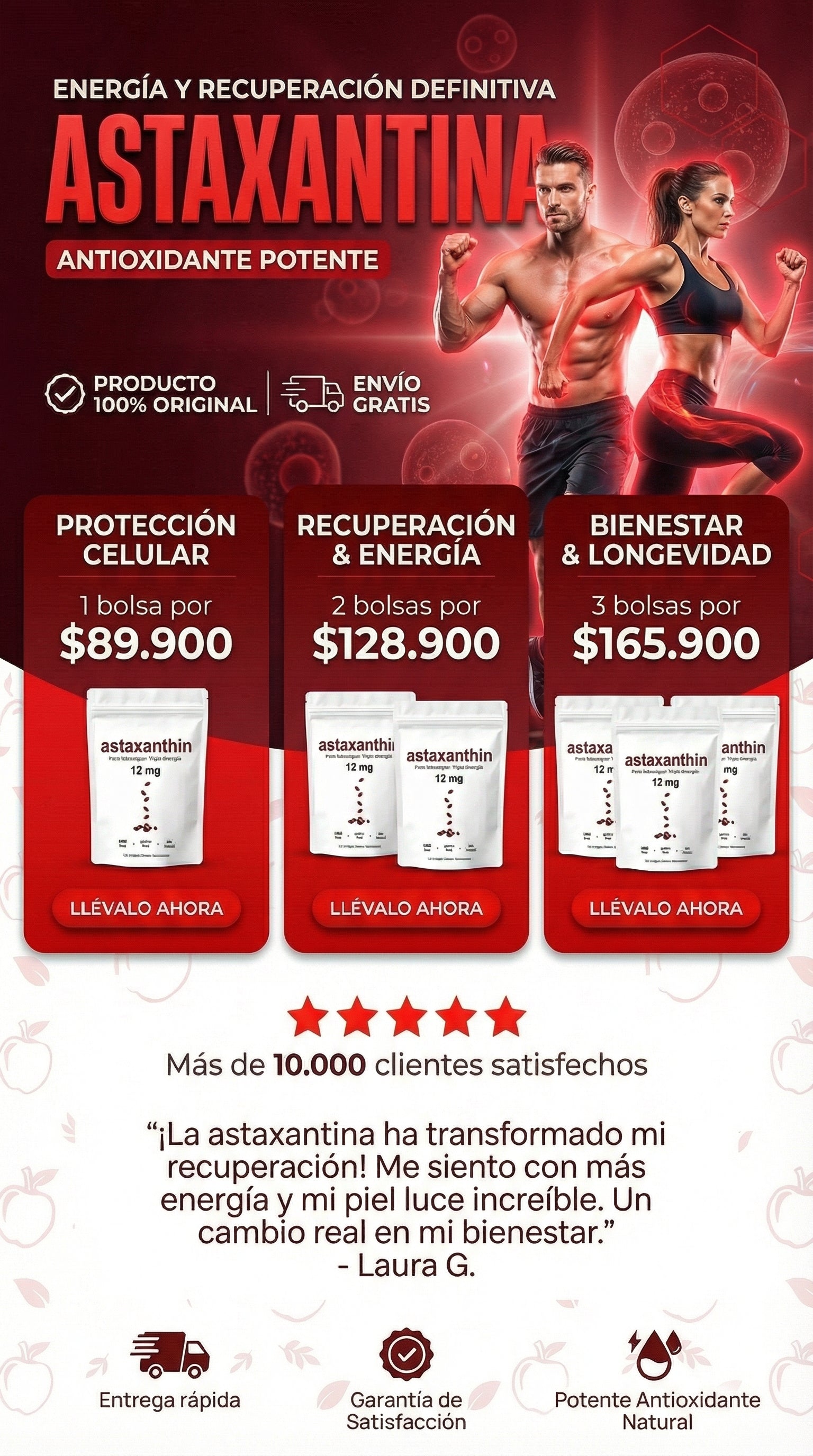 La astaxantina es conocida por ayudar en la recuperación muscular y apoyar la resistencia, siendo utilizada por personas activas que buscan mayor desempeño.