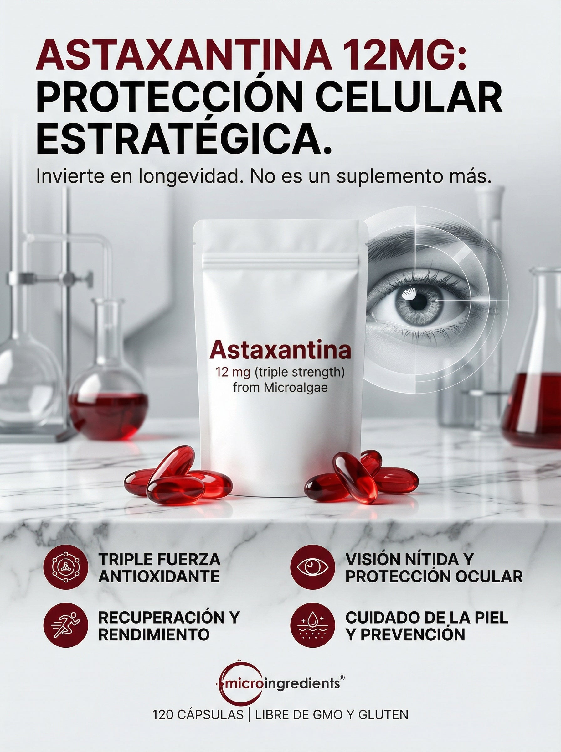 La astaxantina es un antioxidante natural que contribuye a proteger las células frente al estrés oxidativo, incluyendo aquellas relacionadas con la salud ocular y el confort visual.