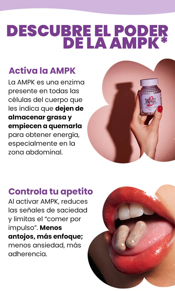AMPK significa AMP-Activated Protein Kinase (quinasa de proteína activada por AMP), una enzima que se encuentra en cada célula de tu cuerpo. Esta enzima es conocida como el “interruptor maestro” del cuerpo porque mejora la regulación del metabolismo y activa la vía de quema de grasa. AMPK actúa alentando a las células a dejar de almacenar grasa y comenzar a convertirla en energía.