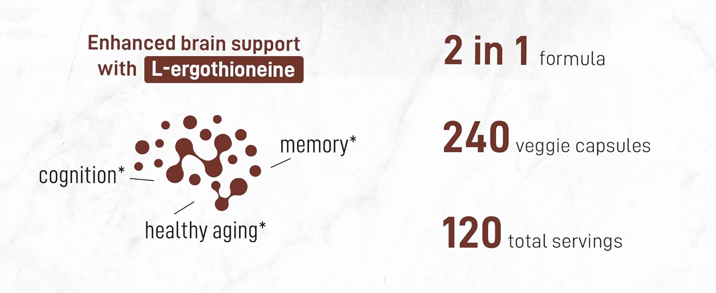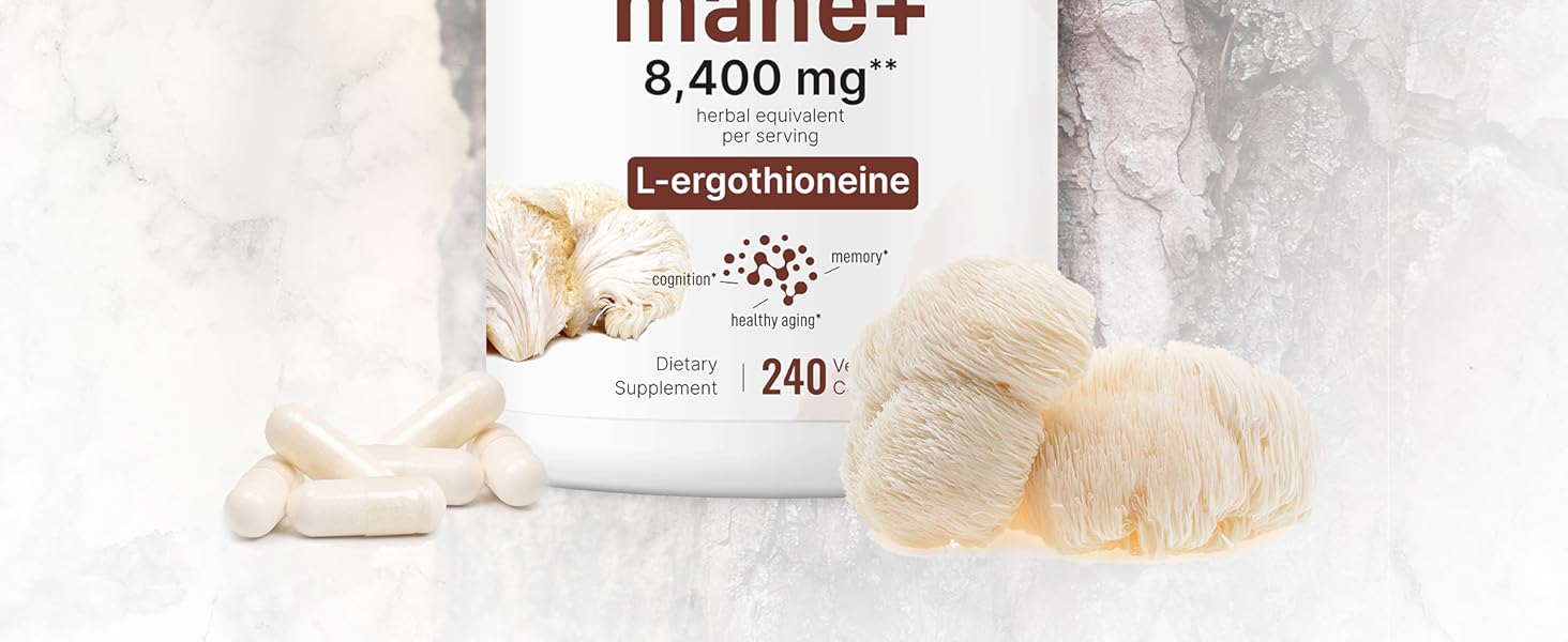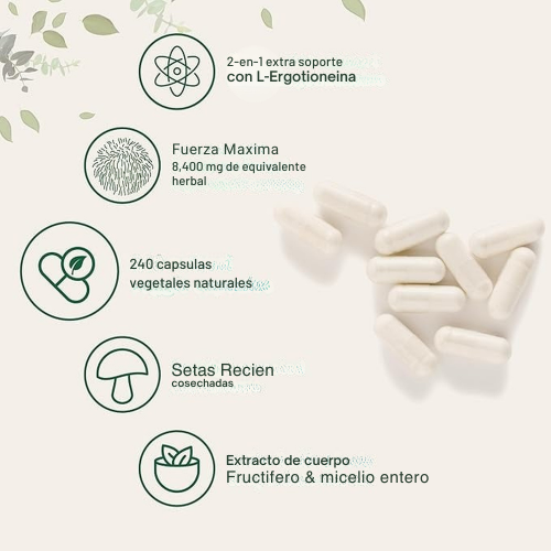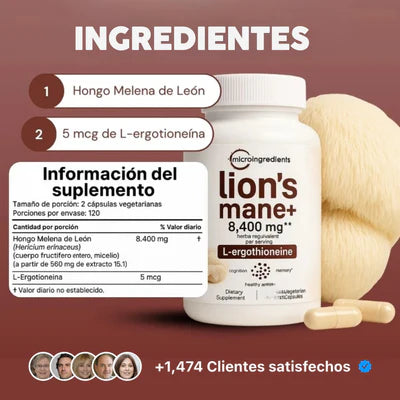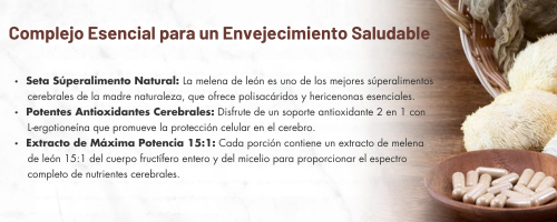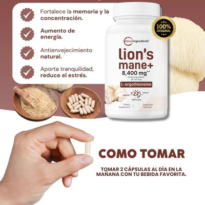 Es un suplemento natural con extracto de hongo Lion’s Mane (Melena de León) y L-Ergothioneine, formulado para apoyar la memoria, la concentración y el bienestar mental. También contribuye al envejecimiento saludable y la salud del sistema nervioso.