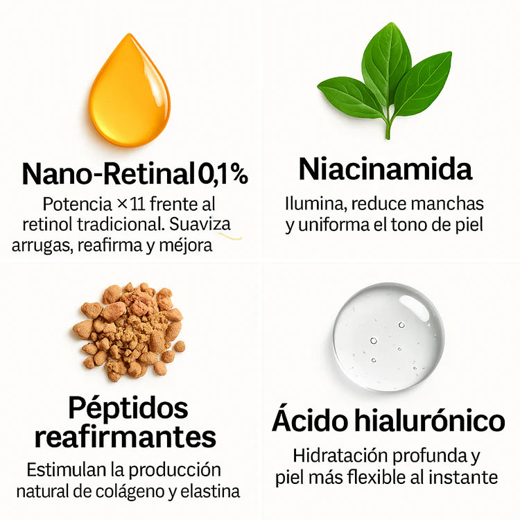 Es un booster de retinal 0.1%, un derivado avanzado de la vitamina A que mejora arrugas, textura, firmeza y luminosidad de la piel.
